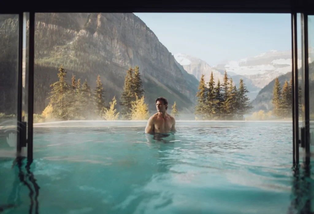 The most significant wellness-focused development is found at the Fairmont Chateau Lake Louise, which unveiled BASIN Glacial Waters in September 2025. This 19,000-square-foot standalone thermal sanctuary, designed by AD100 architect Matteo Thun, is built directly into the mountain’s granite shelf and represents the pinnacle of a multi-year redevelopment. The facility is centered on the power of contrast bathing, featuring a signature Aufguss Sauna where “sauna masters” perform theatrical ceremonies using essential-oil-infused steam and rhythmic towel-waving. Guests follow curated trails through the amenities — for example, the Stillness Trail for nervous system regulation or the Presence Trail for circadian resets — through Finnish saunas, Himalayan salt rooms, and an outdoor infinity vitality pool that juts out toward the iconic Victoria Glacier (the main reason for the lake’s famous turquoise color). To maintain an elite and uncrowded atmosphere, spa access is currently exclusive to overnight guests.