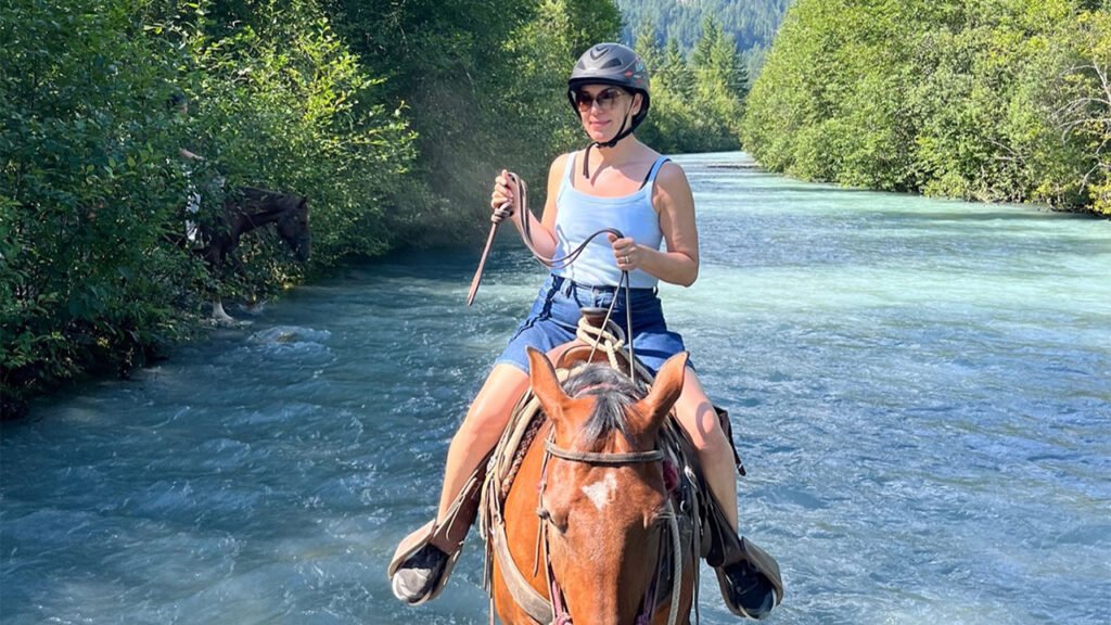 We trotted out into a meadow, my anxiety still buzzing. But with every stride, the rhythm of Captain’s movement began to settle me. My breathing deepened. The wrangler’s calm tips kept me focused. By the time we reached the creek, the nervousness had given way to excitement. The clip-clop of Captain’s hooves on the river rocks, the splash of cool water on my legs, and the swish of the current on that hot day were pure therapy.